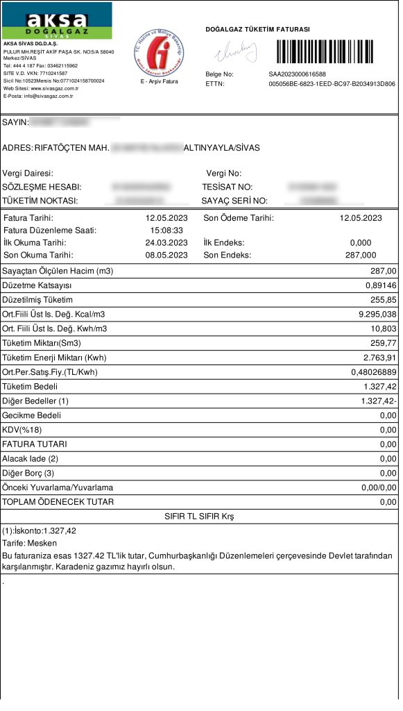Altınyayla da doğalgaz abonelerinin faturaları gelmeye başladı. 1.327 tl faturası gelen bir abonenin toplam ödenecek tutarı 0 tl olarak gözüküyor.
