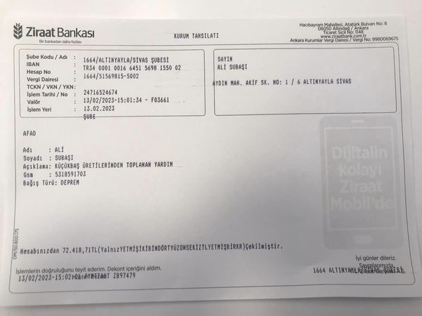 Köylerimizden topladığımız küçükbaş,büyükbaş,nakdi ve ayni yardımları arkadaşlarımızla beraber topladık 1 kamyon gıda, battaniye vb yardımları Malatya Doğanşehir deprem bölgesine ulaştırdıktan sonra kalan nakit paranın bir kısmını Altınyayla Kaymakamlığımıza bir kısmını da Afad’a ulaştırdık.