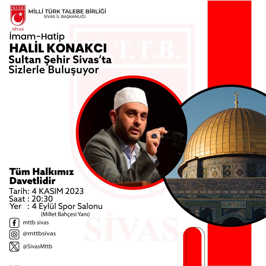 Sivas Milli Türk Talebe Birliği (MTTB) tarafından düzenlenen “Kanayan Yaramız Kudüs ve Filistin” konulu programda, konuşmacı olarak Halil Konakçı Hoca katılacak.