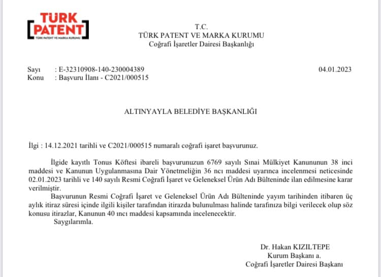 İşaret Başvurusu 140 Sayılı Resmi Coğrafi İşaret ve Geleneksel Ürün Adı Bülteni yayımlandı.